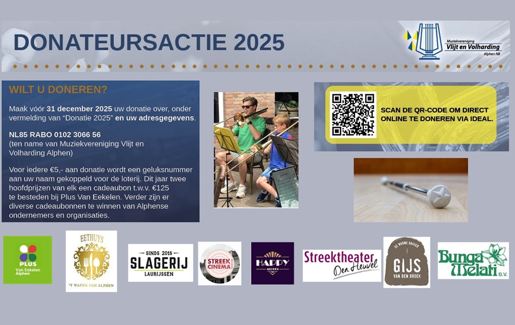 Al de repetities zorgen ervoor dat de vereniging vele optredens gedurende het jaar kan verzorgen. Ook zijn er vaste en incidentele acties om de verenigingskas op peil te houden. En dit alles wordt met vlijt en volharding door onze leden gedaan. Bent u nieuwsgierig geworden? Neem een kijkje op onze uitgebreide website. U kunt natuurlijk ook eens komen kijken en luisteren tijdens één van de repetities, optredens of uitvoeringen.